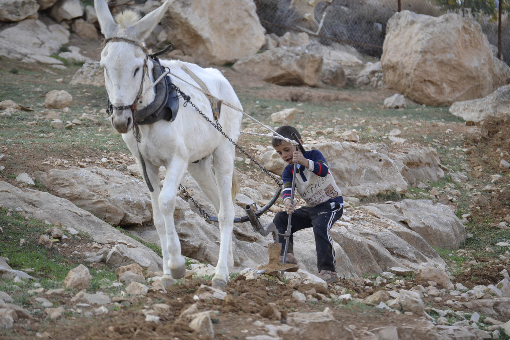 Watching the plowing from the hilltop with Lucifer Farm. In the background you can make out the Israeli settlement of Mitzpe Yair.