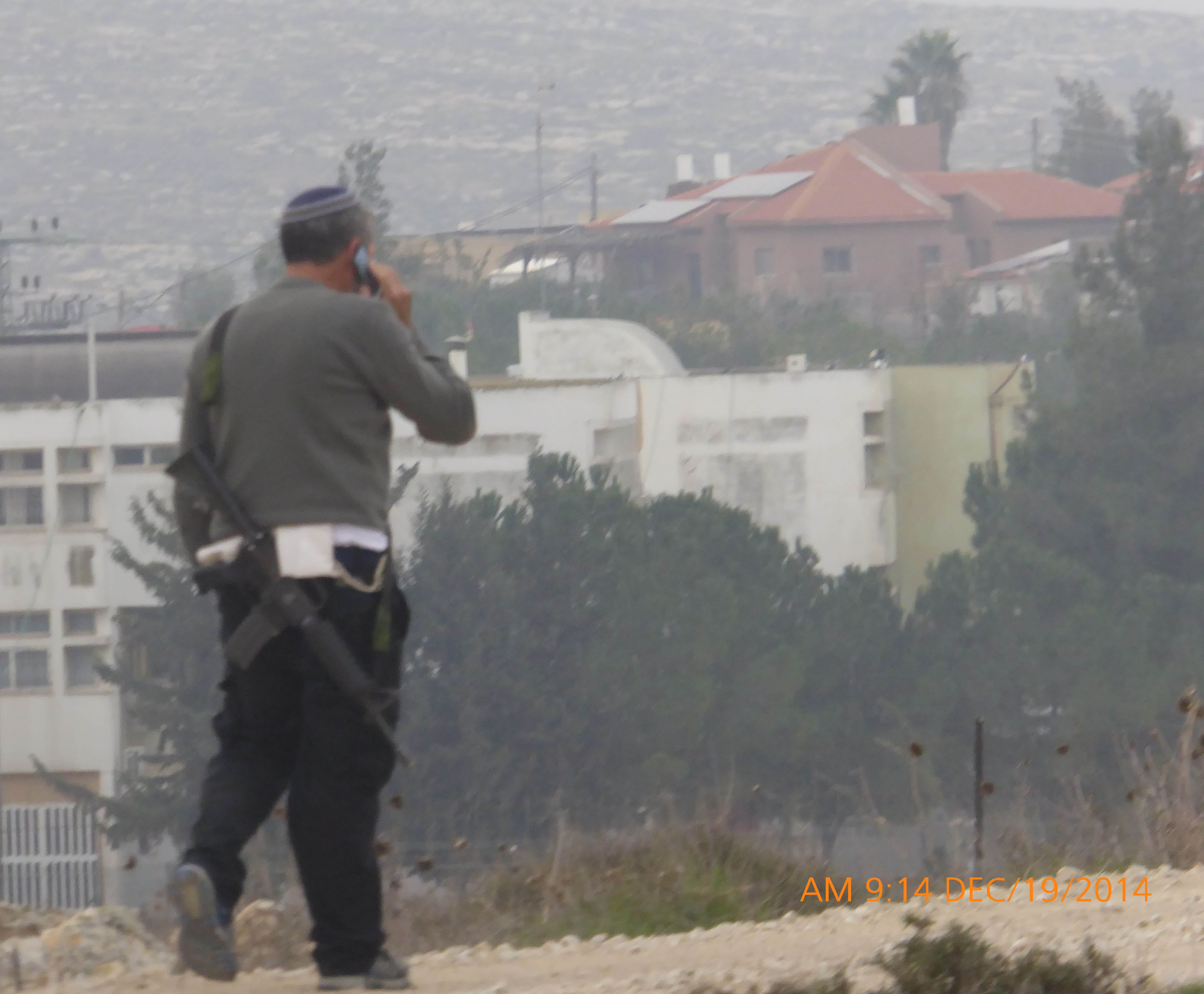 We stayed and sat between the settlement and the plowing. I noticed that one soldier was at the watchtower close by. The Israeli settler stayed on the road making phone calls. Another Israeli vehicle came also and they chatted for awhile and both eventually left. I do not doubt that when the harvest is ready, settlers will be back to burn it as they have done elsewhere. Hopefully I am wrong. What was sown, is to be food for sheep.